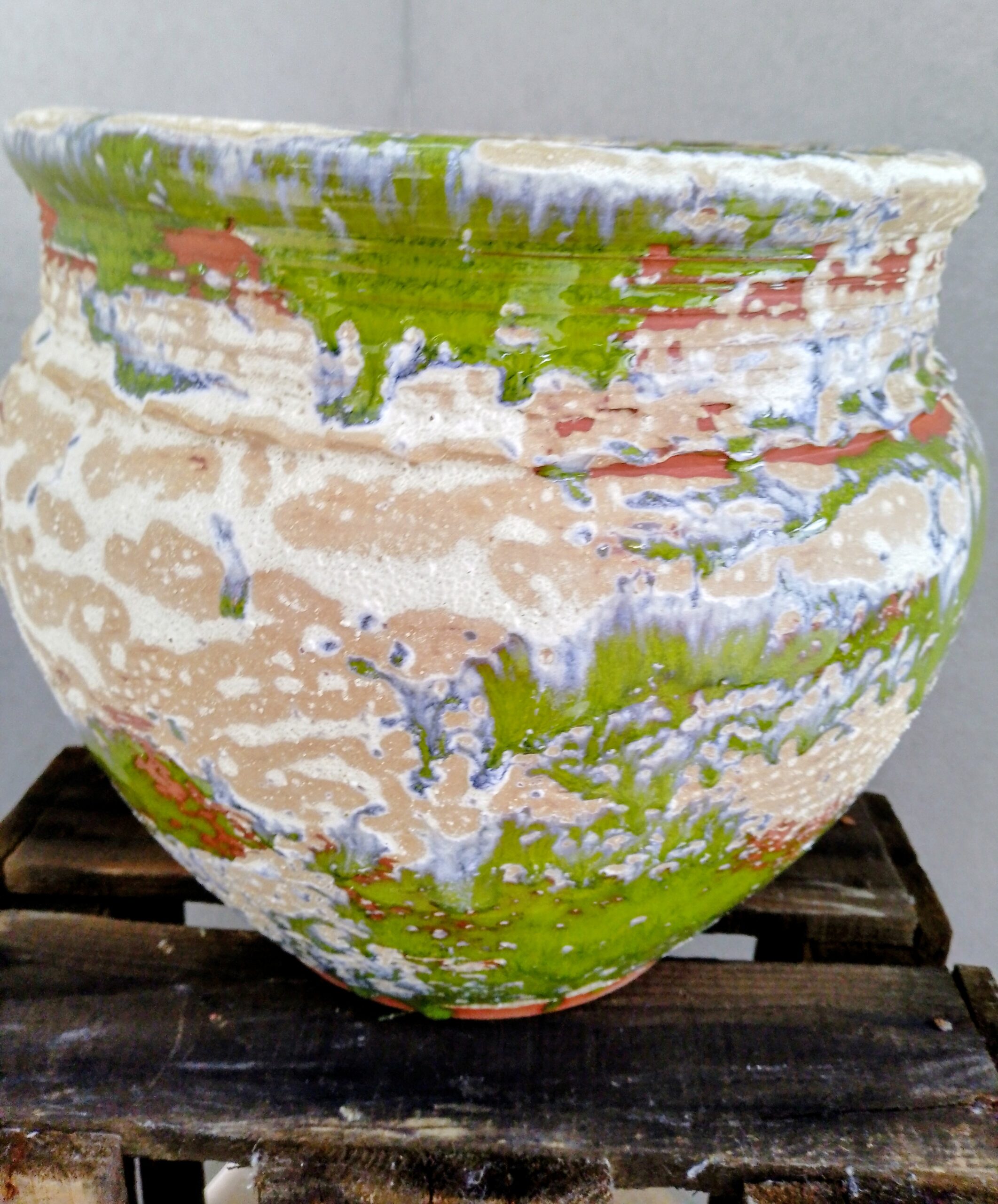 Tem no próprio vaso um designe de  cores vivas em tons de verde